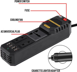 - Built-in Cooling fan: Built-in cooling fan for long span life and safety use. Lower noise and no pollution. Smart size, lightweight and compatible. DC 12V to AC 220V Car Power Inverter is universal for most of cars