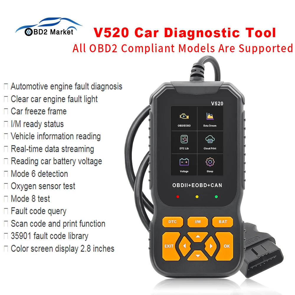 - Full OBDII MODE SCANNER for CAR: As professional car scanner, V520 has all the OBD2 functions you need. Read & clear codes, turn off engine light or MIL, view freeze frame, read I/M readiness, retrieve vehicle VIN, battery voltage test, live data stream (with graphing display), built-in 35901 DTCs, O2 sensor test, onboard monitoring mode, and cloud print data etc
