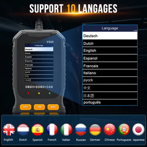 - WIDE COMPATIBILITY - V520 OBD2 scanner for car is compatible with most cars after 1996(USA)/2002(EU)/2008(Asia). If your car has an OBD2 port (16Pin), and the production time meets the above timeline, then your vehicle is compatible. But it is not compatible with new energy vehicles, hybrid vehicles, and models that do not comply with the OBD2 protocol. Displays in English, German, French, Spanish, Italian, Chinese, Japanese, Dutch, Russian and Portuguese; Requires no battery or charger as the unit is powered directly from the OBDII Data Link Connector in the vehicle