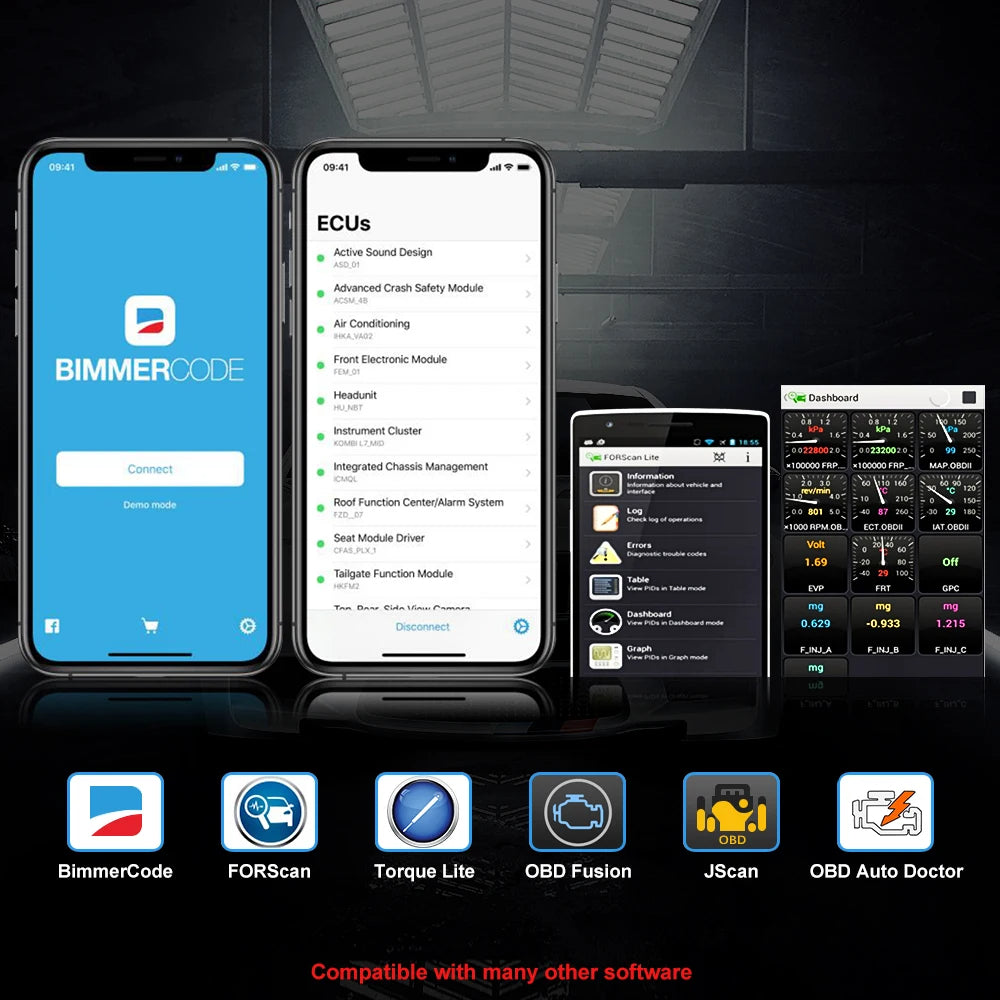 - Our products support popular software such as: BimmerCode/Torque/Forscan/JScan/Auto Doctor/OBD Fusion etc.