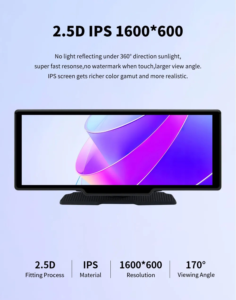 IPS 2.5D Full screen: With 1600*600 resolution and 170° full-viewing angle.
