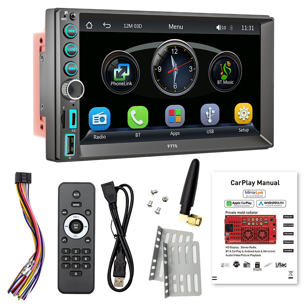 Stereo, HANDSFREE, Remote Control, Amplifier, CarPlay, Mirror Link, android auto, picture in picture, Built-in Microphone, Split Screen, Car Steering Wheel Control