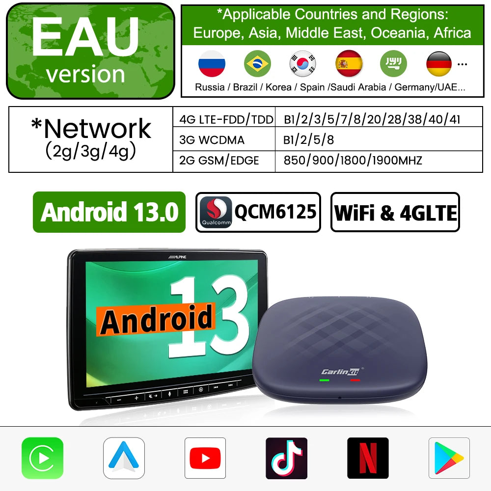 Wireless CarPlay and Wireless Android Auto,Dual Bluetooth,Sim Card,Google Play,browser,Voice,Waze...,2G/3G/4G network support, insert the local operator SIM card, support local phone calls and 4G&Wifi mobile network.