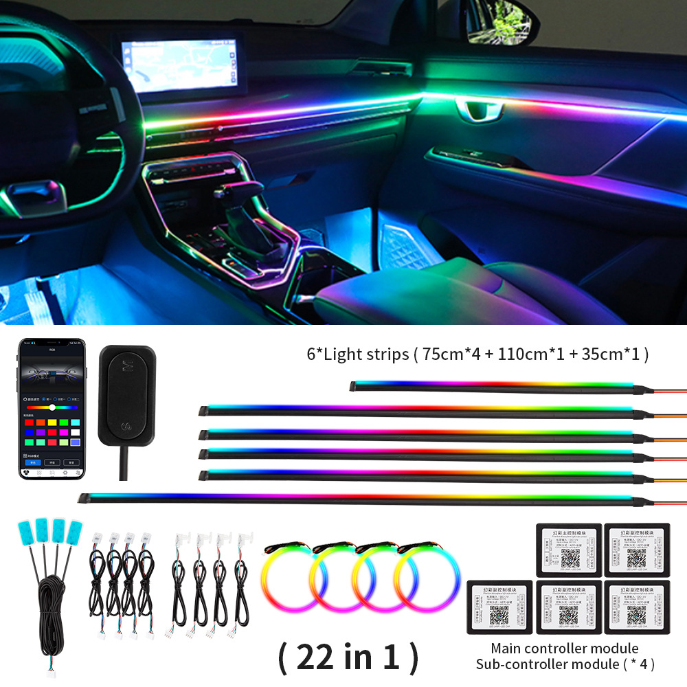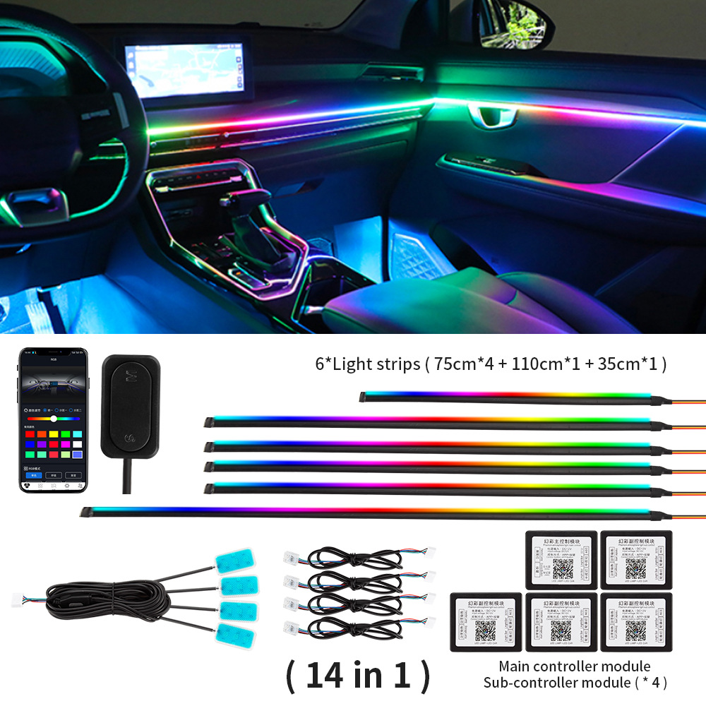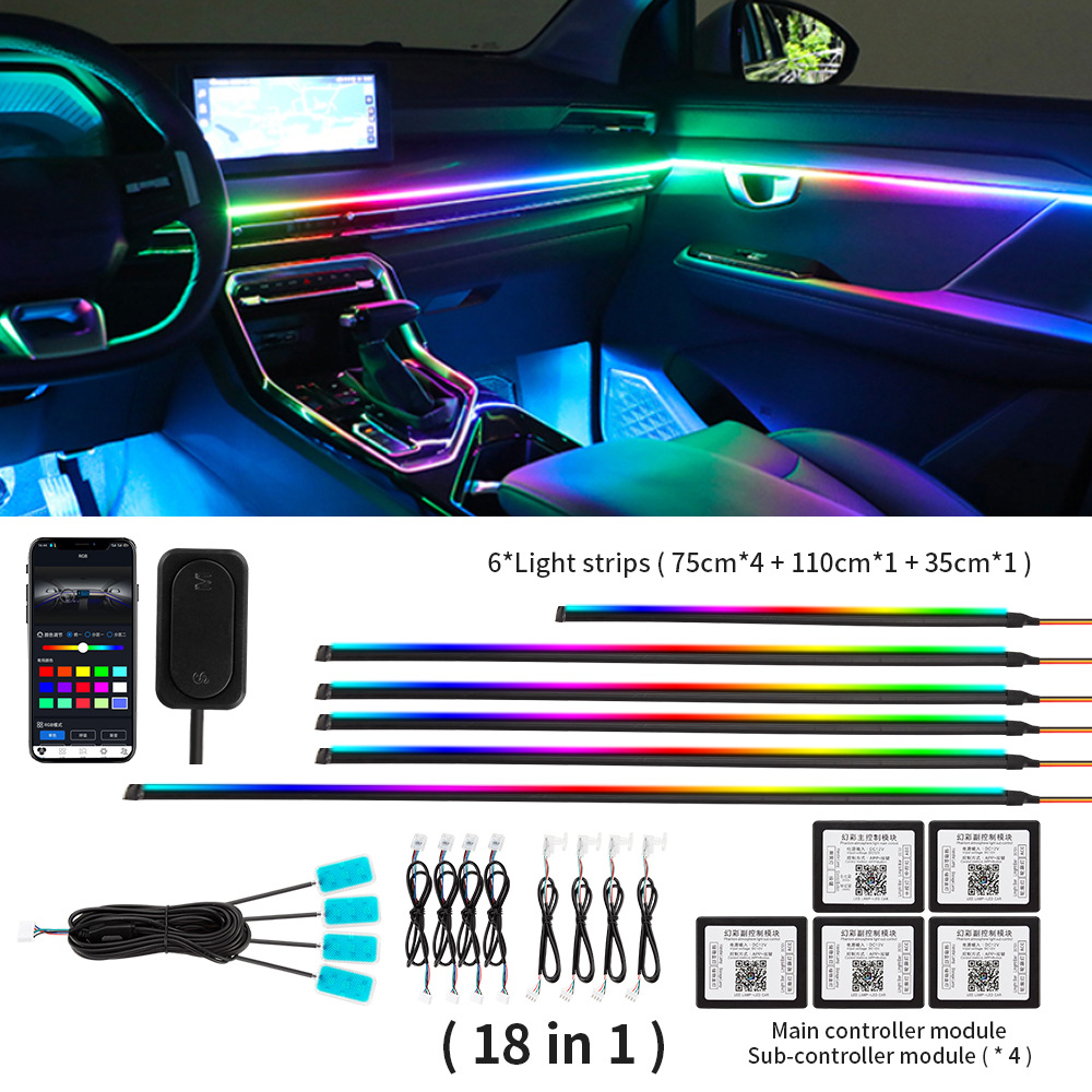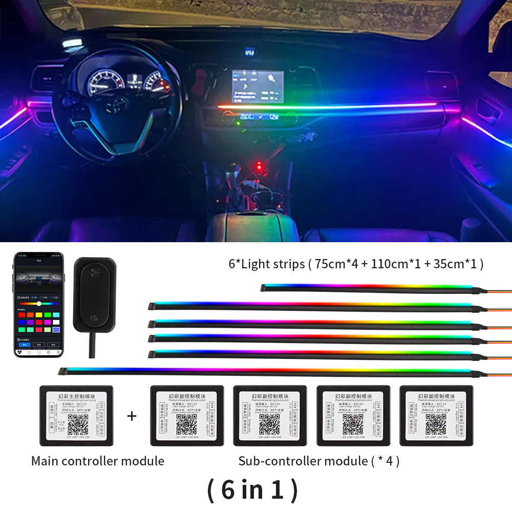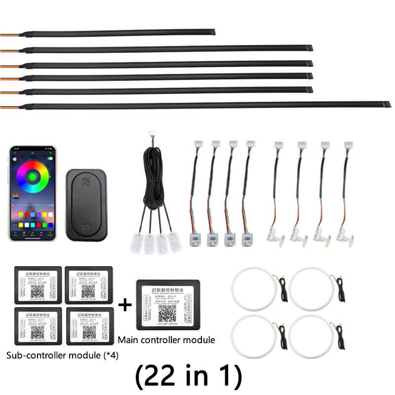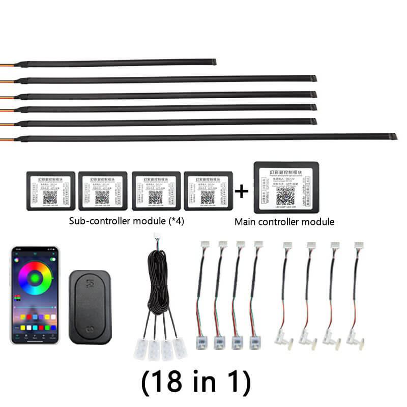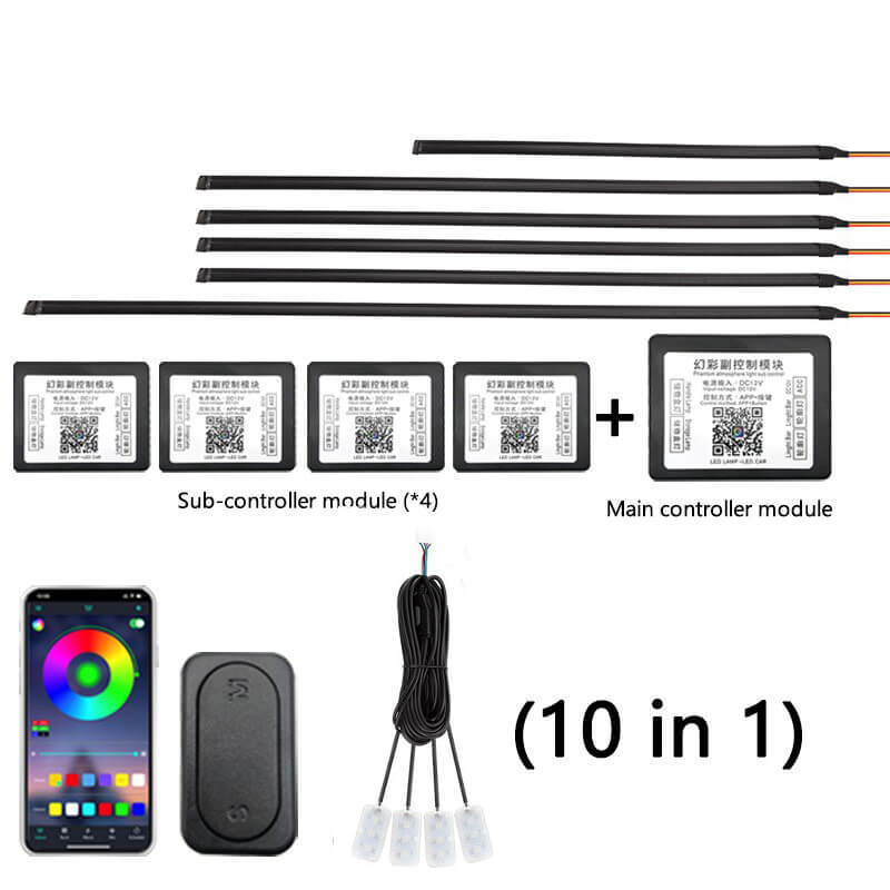 - Download the application by the QR code on the main control box first, control light mode via Bluetooth connection. This product include 1 main control box ,4 sub control box. Each controller has a power cable, the main controller is connected to a 5- 12V power supply such us cigarette lighter (Negative polar and positive polar) and the sub controller also needs to be connected to a 5- 12v power supply such as a door power supply.