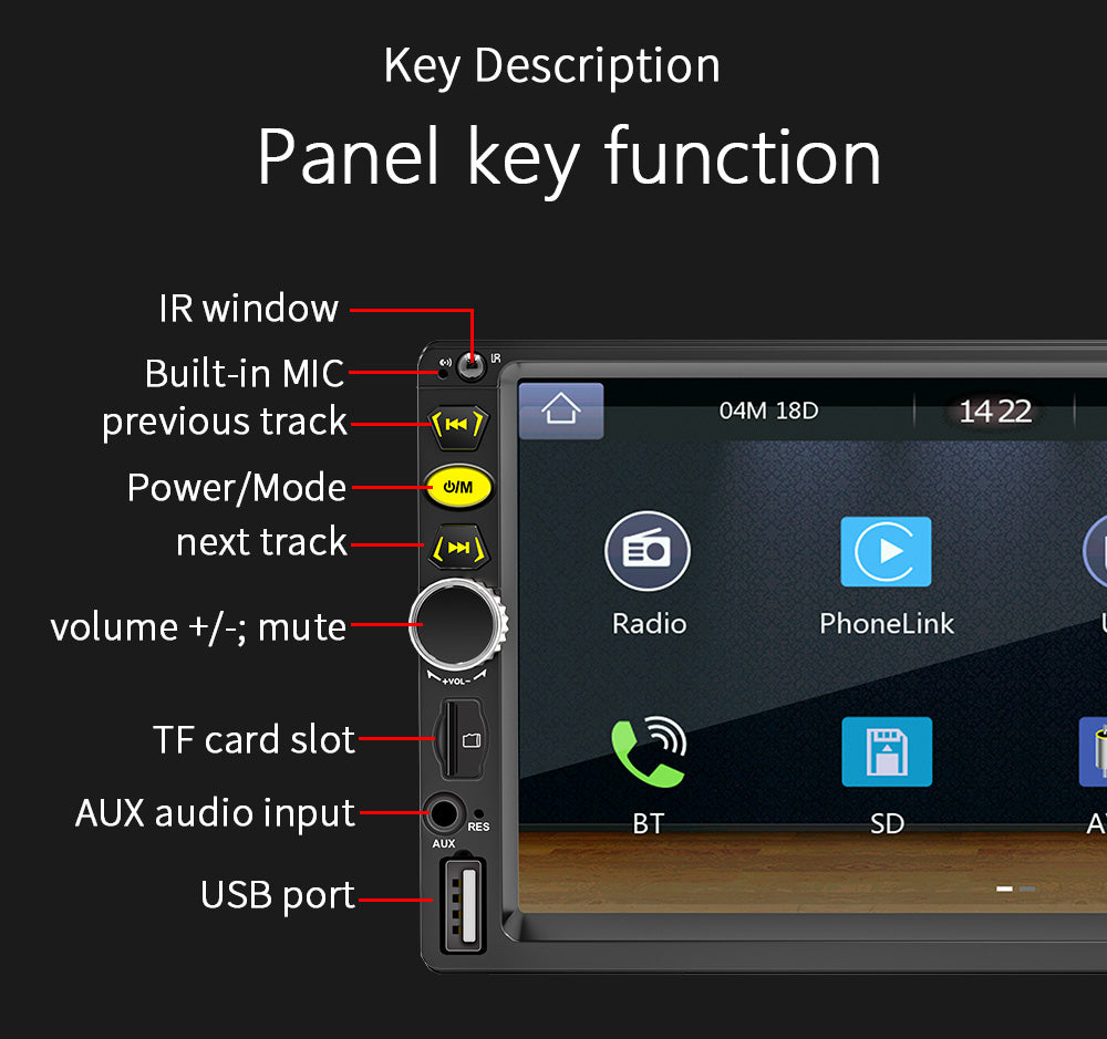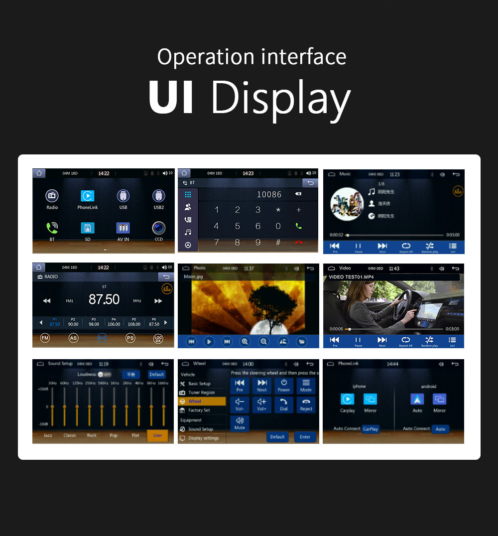 Radio,Read card U disk (audio/video/picture),AUX function,Bluetooth function,RCA audio output can be connected to subwoofer,Reversing rear view function (AHD camera optional),Video input,The original car steering wheel learning function,Mobile phone interconnection Android AUTO/Apple CarPlay,Colorful lights,Rear USB