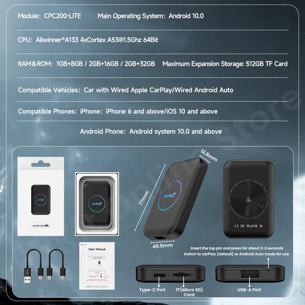 The Carlinkit Tbox Lite is like a magic box for your car, featuring a full Android system. It wirelessly supports CarPlay for iPhones (iOS 10+) and Android Auto for Android phones (Android 11+). Easily display all your favorite apps on your car's display screen.