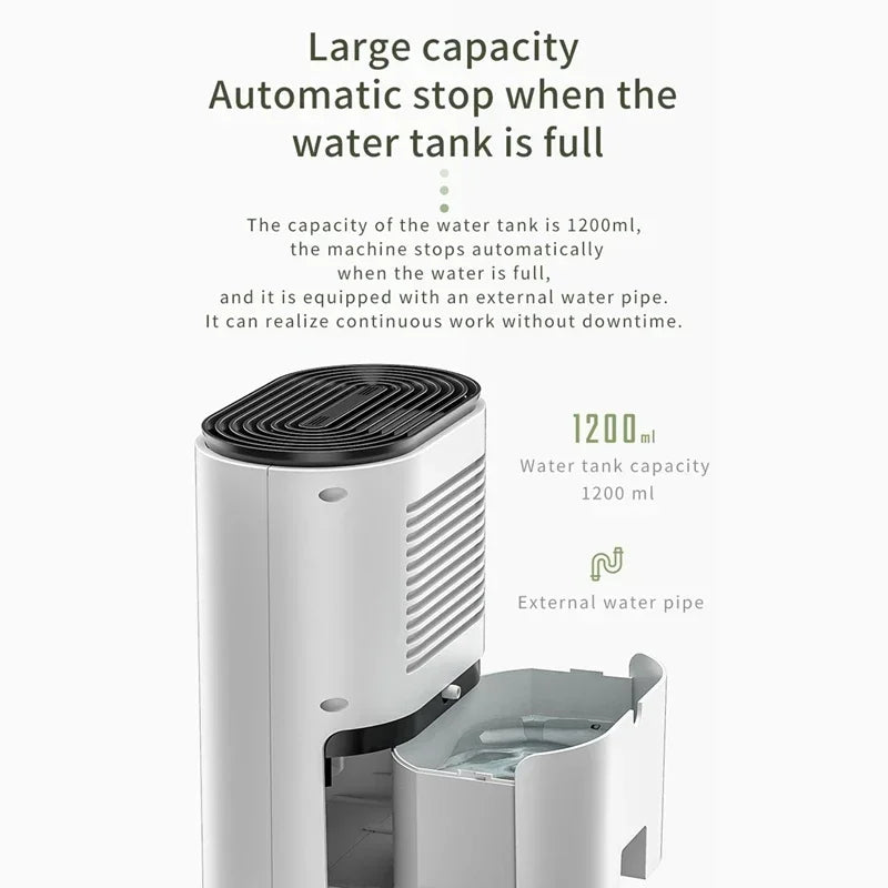 Despite its small size, the dehumidifier offers powerful performance. It features an intuitive humidity setting, automatically starting and stopping once the desired humidity level is reached.