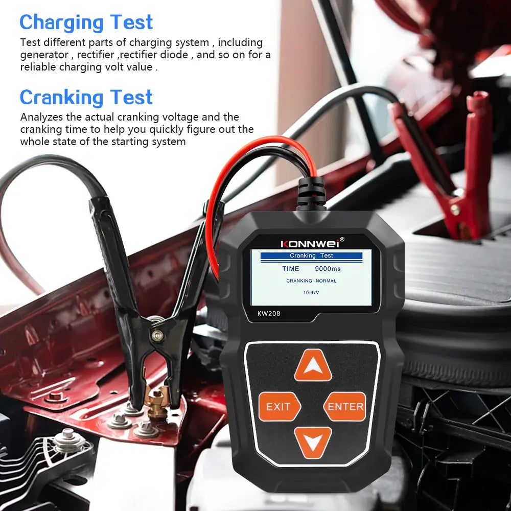 - Automotive Car Battery Tester: KW208 can test all 12V 100-2000CCA batteries including regular AGM flat plate, AGM spiral, or gel batteries. Provide an overall analysis of batteries’ health and help you know its status in advance before it dies. KW208 battery tester support cranking and charging system test also alternator and starter test.