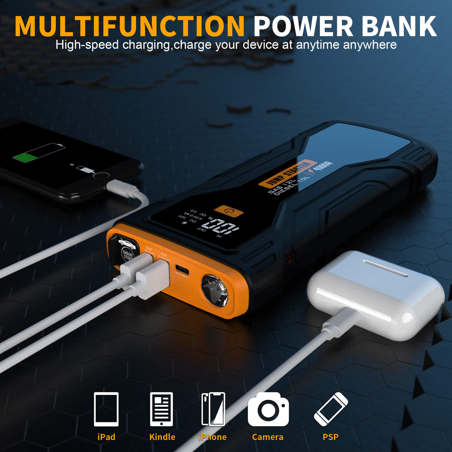 Wide Compatibility and Versatile Power Output: With stable output ports including 5V 2.4A x2 and 9V 2A, this jump starter can charge a variety of devices including smartphones, MP3, MP4, tablets, cameras, and even car accessories like car fridges and pumps. It is compatible with most major brands such as for iOS.