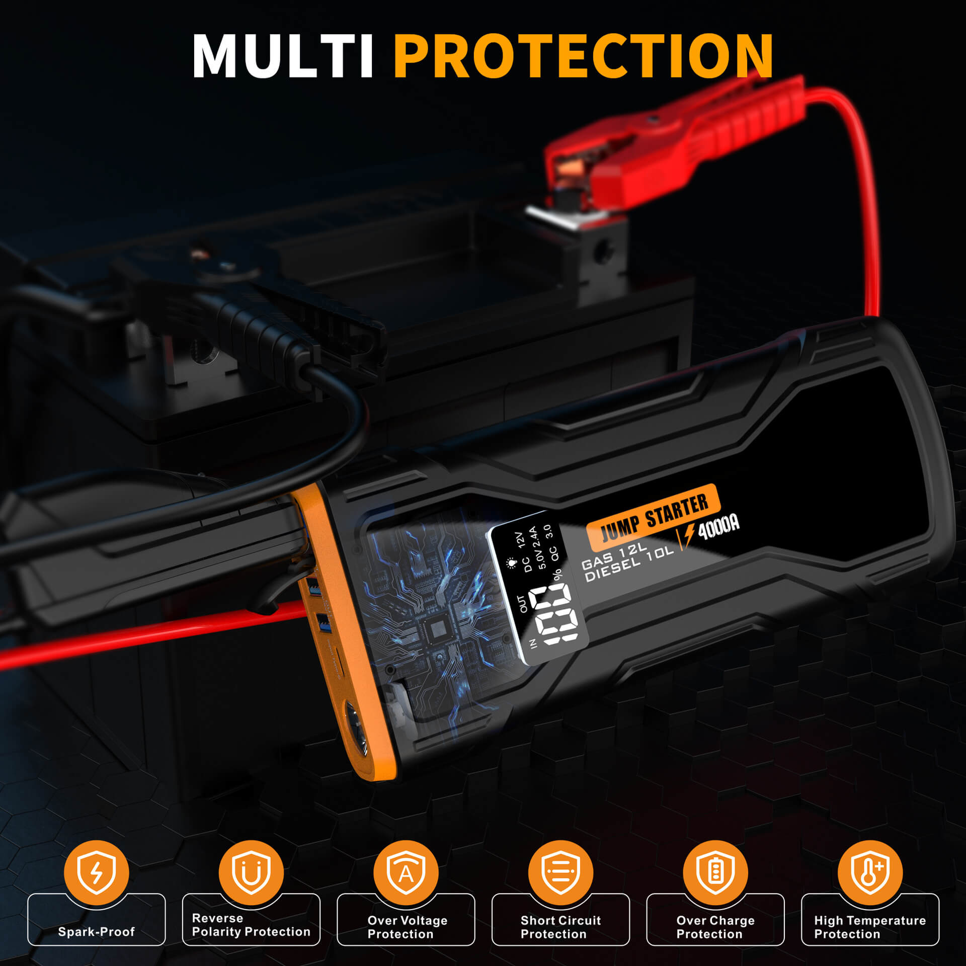 Multi Functional Safety: Equipped with intelligent jumper clips, this jump starter battery pack provides multiple protective functions including short circuit prevention, overcharge prevention, and over discharge prevention. It meets various safety standards, ensuring a safe usage experience.