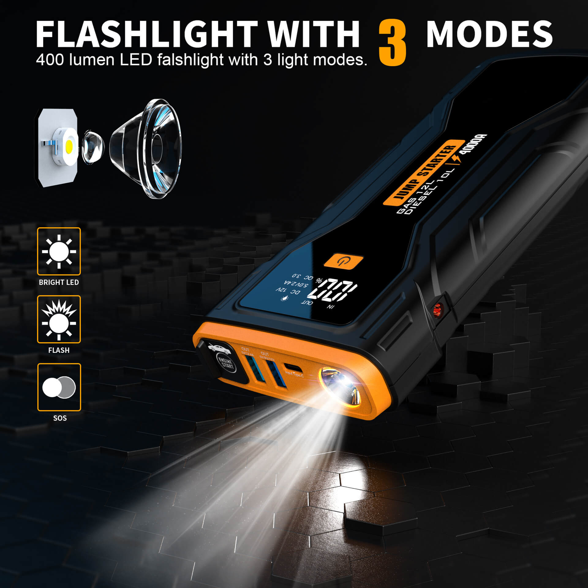 Emergency Lighting: Featuring LED lighting with multiple modes (lighting, flashing, emergency SOS), this car jump starter is ideal for nighttime emergencies such as flat tires or accidents. The SOS mode helps to prevent further accidents and ensures visibility in low light conditions.